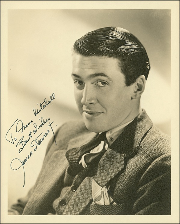 Vintage matte-finish 8 x 10 photo, signed and inscribed in fountain pen “To Irene Mitchell, Best wishes, James Stewart.” Horizontal edges curling lightly, and a few small edge dings, otherwise fine condition. R&R COA.