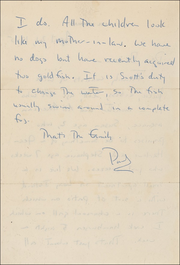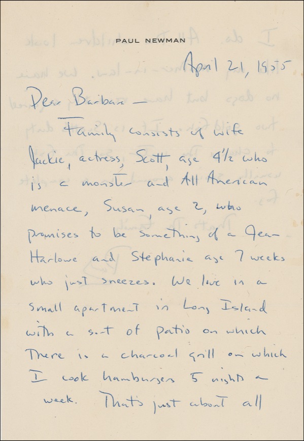 ALS signed “Paul,” 6 x 9, personal letterhead, April 21, 1955. Newman writes to Barbara Rushmore, president of his fan club. In full: “Family consists of wife Jackie, actress [Jackie Witte, to whom Newman was wed from 1949 to 1958], Scott, age 4 1/2 who is a monster and All American menace, Susan, age 2, who promises to be something of a Jean Harlowe [sic] and Stephanie age 7 weeks who just sneezes. We live in a small apartment in Long Island with a sort of patio on which there is a charcoal grill on which I cook hamburgers 5 nights a week. That’s just about all I do. All the children look like my mother-in-law. We have no dogs but recently acquired two goldfish. It is Scott’s duty to change the water, so the fish usually swim around in a complete fog. That’s the family....” At the time he penned this letter, Newman was in the midst of his second Broadway role, as Glenn Griffin in the suspense melodrama The Desperate Hours. (The play was made into a film released later that year, with Humphrey Bogart in the same role). At that point, Newman had appeared in only one movie, the sword-and-sandals epic The Silver Chalice—a performance he so regretted that he took out a newspaper ad of apology when the film aired on television in 1966. Newman’s son, Scott, died of a drug overdose in 1978. Accompanied by the personalized mailing envelope addressed in Newman’s hand and bearing his printed return address at the Barrymore Theatre. A touch of mild handling wear, otherwise fine, clean condition. Over the course of a career spanning six decades, Newman has earned a reputation within the collecting community as a reluctant, even volatile signer; letters of this length and early date, coupled with the unusually personal content, are quite scarce. PSA/DNA Auction LOA and R&R COA.
