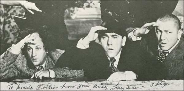 Cardstock 6 x 3 photo of Moe, Larry, and Curly on the lookout, signed and inscribed along the bottom in black ballpoint “To Donald Rollins from your buddy Larry Fine 3 Stooges.” In fine condition. PSA/DNA Auction LOA and R&R COA.