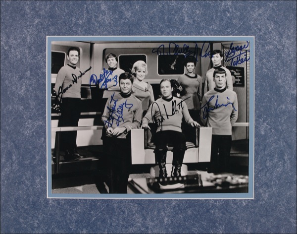 Glossy 13 x 10 cast photo, signed in blue and black felt tip by seven: William Shatner, Leonard Nimoy, George Takei, Nichelle Nichols, DeForest Kelley, Walter Koenig, and James Doohan. Matted to an overall size of 20 x 16. A few scattered dings and surface marks, and small rub to Nimoy’s signature, otherwise fine condition. R&R COA.
