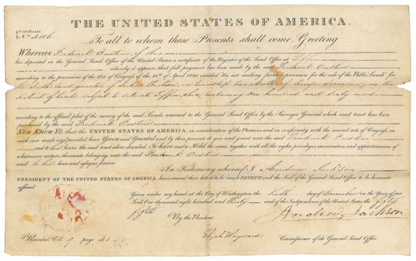 Partly printed DS as president, one page on vellum, 15.5 x 9.5, December 6, 1830. A grant for a parcel of land in Ohio issued to Frederick Onstine. In very good condition, with intersecting folds, one chip each to left and right edges, light soiling a few scattered stains (very subtle staining to signature area), and seal removal traces at lower left. The signature is large, dark, and clear. Auction LOA John Reznikoff/PSA/DNA and R&R COA.