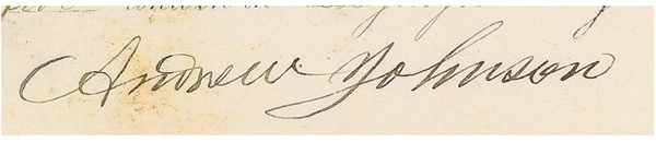 Partly printed DS as president, one page on vellum, 16 x 19.75, May 20, 1865. A commission for Elijah R. Craft as assistant adjutant general of volunteers with rank of captain. Countersigned by Edwin Stanton as secretary of war. The embossed paper seal remains intact at upper left. Heavy intersecting creases (touching Stanton’s signature) and a few scattered stains (faint stain to first name), otherwise fine condition. An unusually bright, crisp example! Auction LOA John Reznikoff/PSA/DNA and R&R COA.