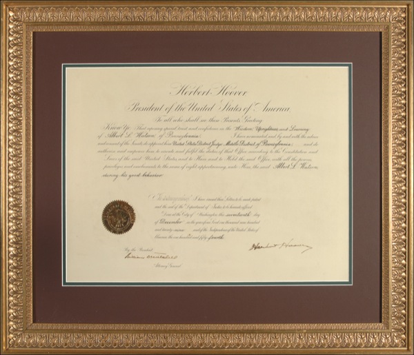 Partly printed DS as president, one page, 18.25 x 14, December 17, 1929. An appointment for Albert Watson as a U.S. District Judge in Pennsylvania. Countersigned by William DeWitt Mitchell as attorney general. Matted and framed to an overall size of 26.75 x 23. A touch of mild soiling with a few faint, tiny spots, and Hoover retracing the first few letters of his first name due to poor ink flow, otherwise fine, clean condition. Auction LOA John Reznikoff/PSA/DNA and R&R COA. Oversized.