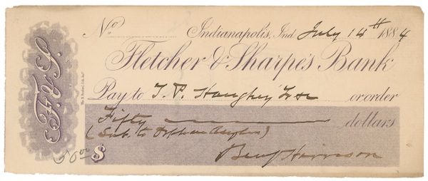 Bank check, 7 x 3, filled out and signed as “Benj. Harrison,” payable to T. P. Haughy for $50.00, July 14, 1884. Faint vertical folds (one to last name, cut cancellations and a few pinholes, and a touch of mild soiling and handling wear, otherwise fine condition. Auction LOA John Reznikoff/PSA/DNA and R&R COA.