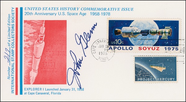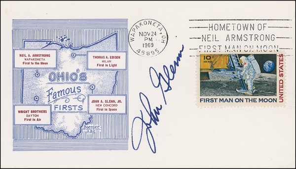Two different commemorative covers, one honoring Neil Armstrong’s home town, and the other a limited edition honoring the 20th anniversary of the space age, each signed on the front in blue felt tip by Glenn. In very fine condition. COA Scott Cornish and R&R COA.