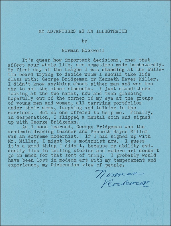 TQS entitled My Adventures as an Illustrator, one page 6 x 8. Rockwell recounts an early decision regarding his art instruction. In part, “It’s queer how important decisions…are sometimes made haphazardly. My first day I was standing at the bulletin board trying to decide whom I should take life class with; George Bridgeman or Kenneth Haynes Miller…If I had signed up with Mr. Miller, I might be a modernist now. I guess it’s a good thing I didn’t because my ability evidently lies in telling stories and modern art doesn’t go for that sort of thing. I probably would have been lost in modern art with my temperament and experience, my Dickensian view of people.” Signed at the conclusion in blue ballpoint. In very fine condition. R&R COA.