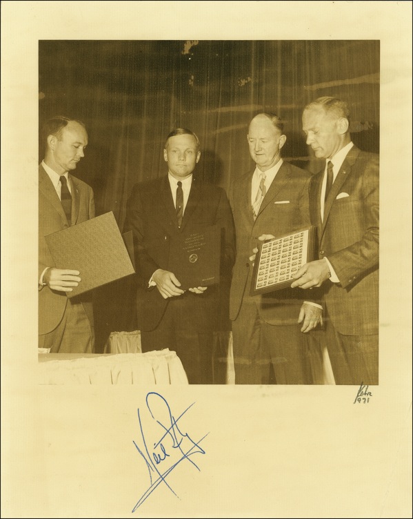 Textured matte-finish sepia 8 x 10 photo of the Apollo 11 astronauts at the 1969 dedication ceremony for the moon landing airmail stamp (this copy printed in 1971), signed in blue ink. The photographer, [Ernest A.] Kehr, has signed in pencil at lower right. In very good condition, with a few marginal creases, slight discoloration to image, and light emulsion spots and irregularities. The signature is dark and clear. COA Scott Cornish and R&R COA.
