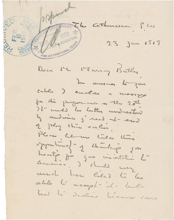 Scottish author and dramatist (1860–1937) best known for the classic children’s play Peter Pan. ALS, one page both sides, 5.25 x 7, January 23, 1919. Barrie writes to Nicholas Murray Brown (1862–1947), President of Columbia University, head of the Carnegie Endownment for International Peace, and co-winner of the 1931 Nobel Peace Prize. In full: “In answer to your cable I enclose a message for the performance on the 20th. It would be better understood by [the] audience if read at end of play than earlier. Please let me take this opportunity of thanking you for your invitation to America. I should very much have like to be able to accept it, but had to decline because some matters tie me down here. I think in time friendship between America and this country would be the finest thing that would happen in the world….” Accompanied by a carbon of Butler’s reply, bearing a stamped signature. Secretarial ink stamps and notations, and a touch of mild soiling and handling wear, otherwise fine condition. R&R COA.