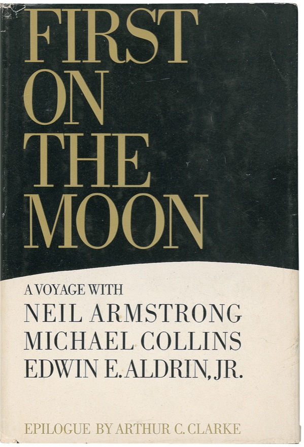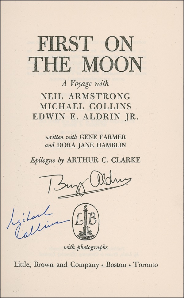 Signed book: First On the Moon. Book Club edition. Boston: Little, Brown, and Company, 1970. Hardcover with dustjacket, 5.75 x 8.5, 511 pages. Signed on the title page in black ink by Buzz Aldrin and in blue ink by Michael Collins. In fine condition, with some scattered dings and creases to dustjacket. Still room for an Armstrong signature for the ambitious and resourceful collector. COA Scott Cornish and R&R COA.