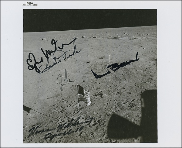 Glossy 10 x 8 NASA photo of the American flag on the lunar surface placed during the Apollo 11 mission, signed in black felt tip by Edgar Mitchell, Charlie Duke, Alan Bean, and Jim Irwin. In very fine condition. COA Scott Cornish and R&R COA.