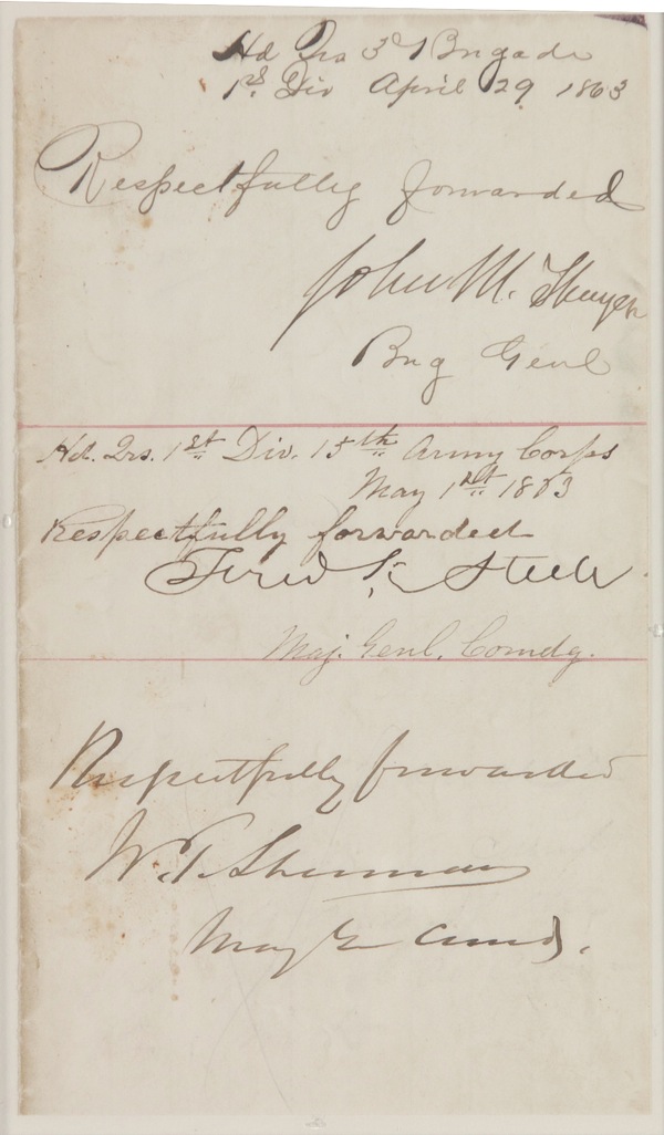 Ink endorsement, “Respectfully forwarded, W. T. Sherman, Maj. G. Comd,” on a 3.25 x 6 slip from a document dated April–May 1863. The slip has also been endorsed by Brigadier General John M. Thayer (1828–1906) and Major General Fredk. Steele (1819–1868). Matted and framed with a period portrait engraving and descriptive plaque to an overall size of 16 x 17. Light soiling, otherwise fine condition. R&R COA.