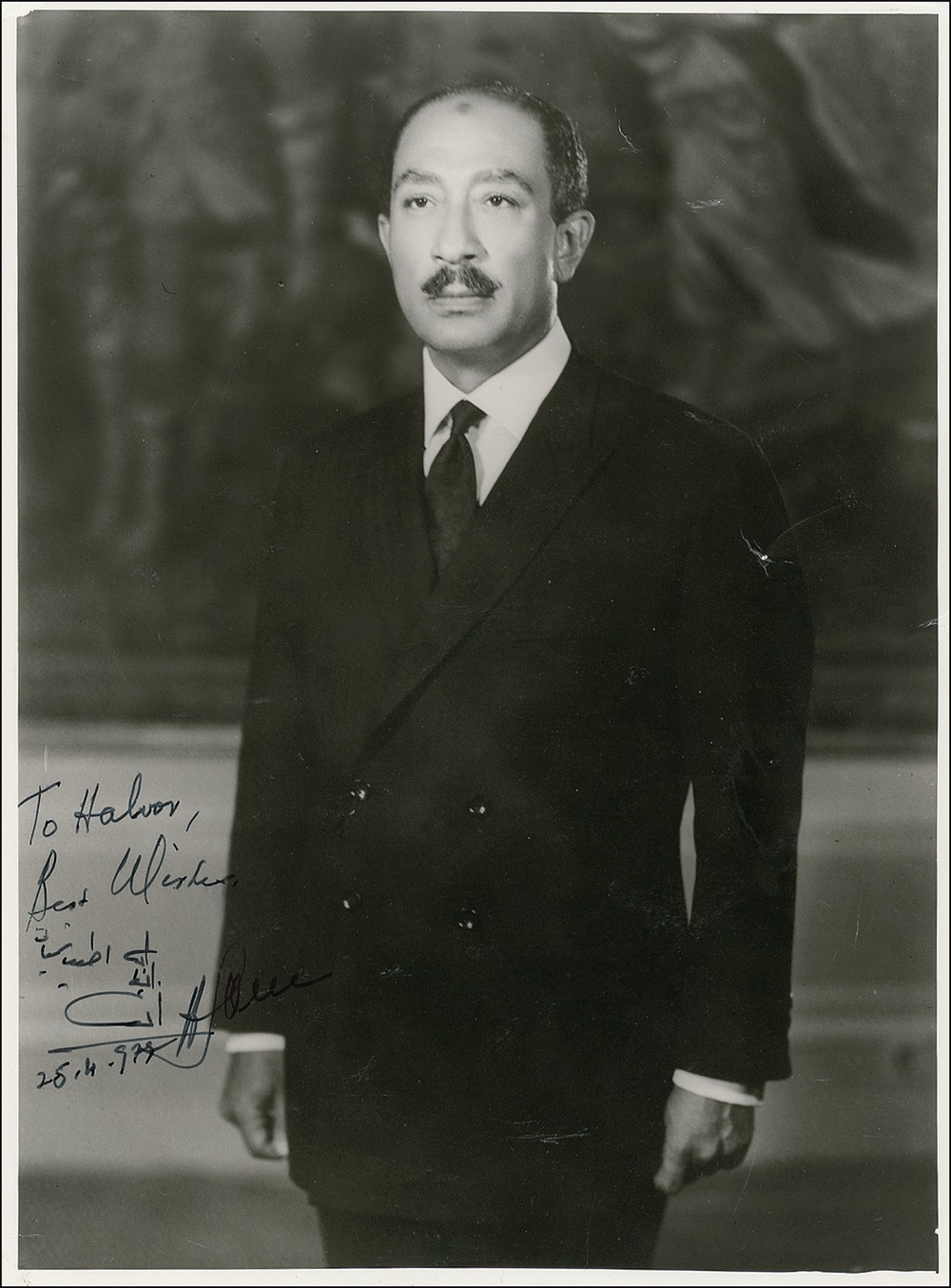 President of Egypt (born 1918) from 1970 until his assassination in 1981. For his role in the historic Camp David Peace Agreement, he shared the 1978 Nobel Peace Prize with Israeli Prime Minister Menachem Begin. Pearl-finish 7 x 9.5 photo, signed and inscribed in black ink and dated November 25, 1979. In very good condition, with scattered creases to image, and small area of surface loss to top left corner. None of the flaws affect the signature. R&R COA.