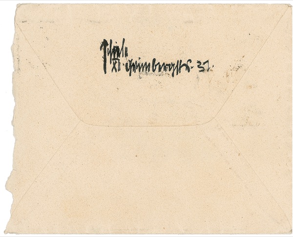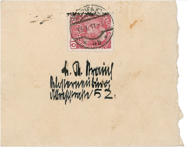 Influential and forward-looking Austrian artist (1890–1918) who takes a place among the leading figures of the Expressionist movement of the early twentieth century. Schiele was among the millions of Europeans who succumbed to the Spanish flu during the epidemic of 1918. Scarce ink signature, “Schiele,” adding his return address, on a 4.5 x 3.5 mailing envelope illegibly addressed in his hand and postmarked 1911. In very good condition, with irregular edge from opening, slight blotting to signature, scattered light soiling and wrinkling, and a few small stains. The writing is dark and bold. R&R COA.