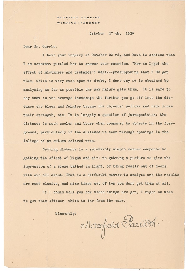 American artist (1870–1966) best known for his luminous, often fantastic landscapes and romantic illustrations of nudes. His 1920 painting Daybreak was extensively reproduced, becoming the biggest-selling print of its day. Interesting TLS, one page trimmed in size to 7 x 10.5, personal letterhead, October 27, 1929. Parrish writes to Mr. Currie. In part: “I am somewhat puzzled how to answer your question. ‘How do I get the effect of mistiness and distance?’ Well? presupposing that I DO get them, which is very much open to doubt, I dare say it is obtained by analyzing as far as possible the way nature gets them. It is safe to say that in the average landscape the farther you go off into the distance the bluer and fainter become the objects: yellows and reds loose [sic] their strength, etc. It is largely a question of juxtaposition: the distance is much cooler and bluer when compared to objects in the foreground, particularly if the distance is seen through openings in the foliage of an autumn colored tree. Getting distance is a relatively simple manner [sic] compared to getting the effect of light and air: to getting a picture to give the impression of a scene bathed in light, of being really out of doors with air all about. That is a difficult matter to analyze and the results are most elusive, and nine times out of ten you don’t get them at all. If I could tell you how these things are got [sic], I might be able to get them oftener, which is far from the case….” In very good condition, with trimming as noted, intersecting folds (light vertical fold to “P”), staple holes, and a few wrinkles. R&R COA.