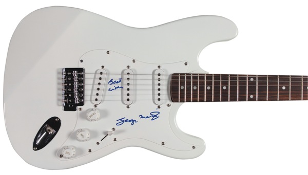 White-bodied Signature Series ‘stratocaster-style’ electric guitar, signed on the white pickguard in blue felt tip by Martin. In fine condition. COA Roger Epperson/REAL and R&R COA. Oversized.