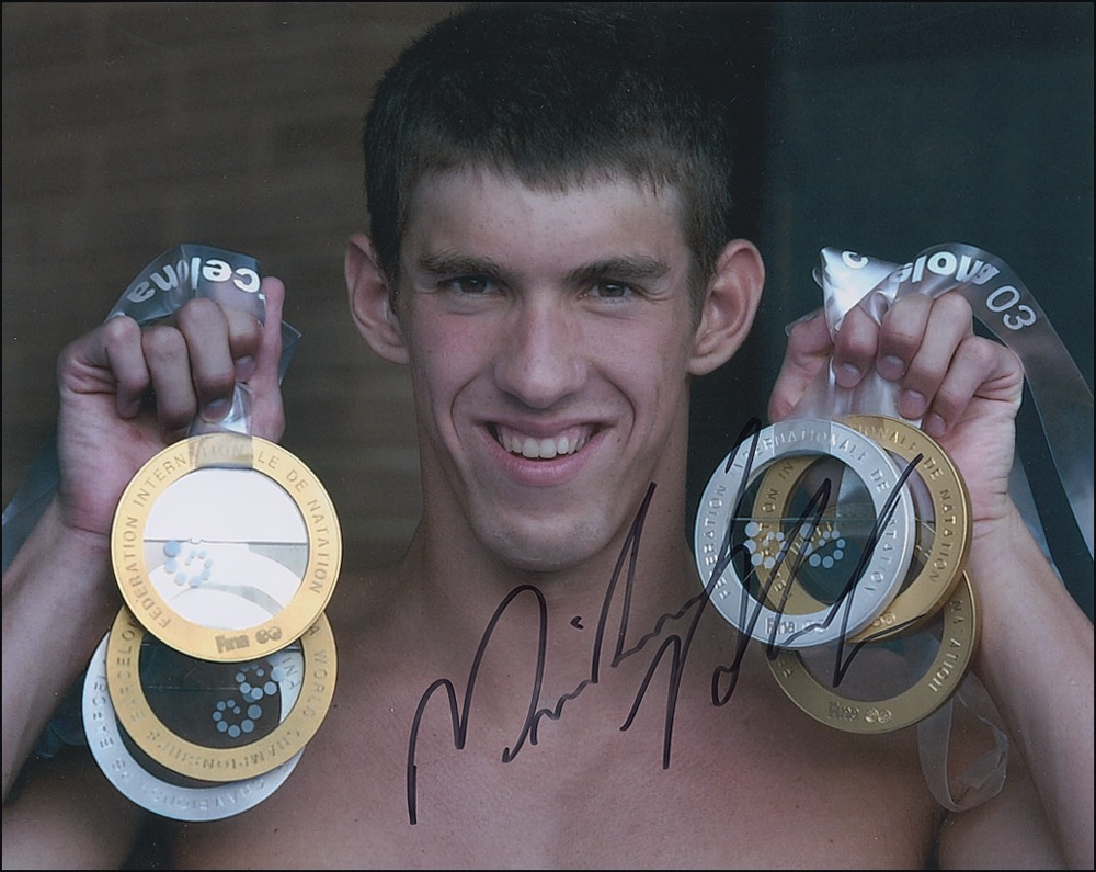Color glossy 10 x 8 photo of Phelps with a double handful of medals, signed in black felt tip. In very fine condition. Auction LOA Steve Grad/PSA/DNA and R&R COA.