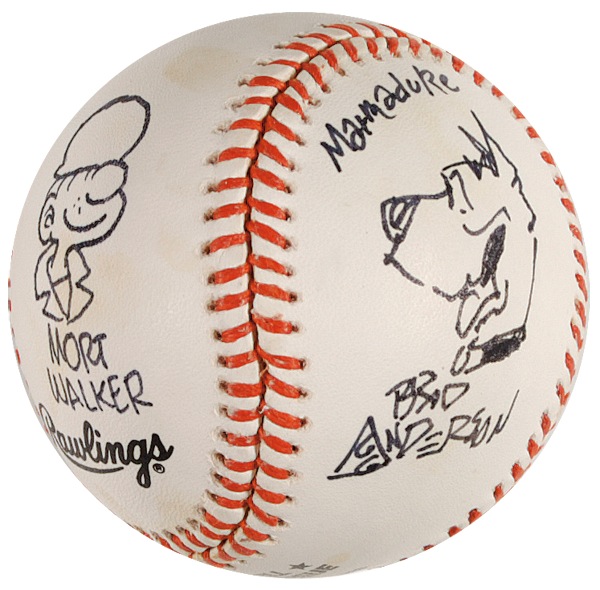 Official Rawlings American League Cal Ripken, Jr. commemorative baseball signed in ink on the side panels by four different cartoonists, each adding a sketch of one of their characters. Signers are: Gary Trudeau (Doonsebury), Ron Ferdinand (Dennis the Menace), Mort Walker (Sgt. Snorkel), and Brad Anderson (Marmaduke). In fine condition, with a couple spots of trivial toning. R&R COA.