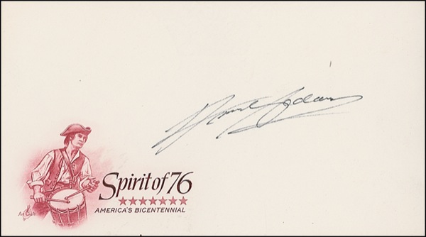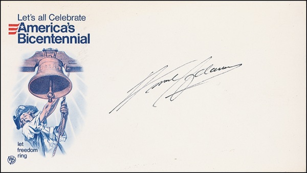 Two unstamped commemorative postal covers with cachets honoring the U.S. Bicentennial, 6.5 x 3.5, each signed in black ink. Light handling wear, otherwise fine condition. R&R COA.