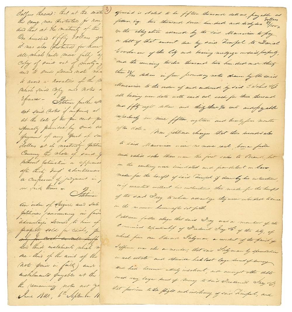 British-born American politician and lawyer (1811-1884) who, after serving in the U.S. Senate and rejecting nomination to the Supreme Court, served variously as attorney general, secretary of war, and secretary of state for the Confederacy. Manuscript DS, signed “Benjamin, Atty.,” four pages both sides, 8 x 13, no date [circa 1840s]. A legal petition filed in the Parish Court of New Orleans in a case involving repayment of a promissory note. In very good condition, with light toning, light wrinkling and handling wear, and partial separations along folds (slightly touching “B”; archival reinforcements). R&R COA.