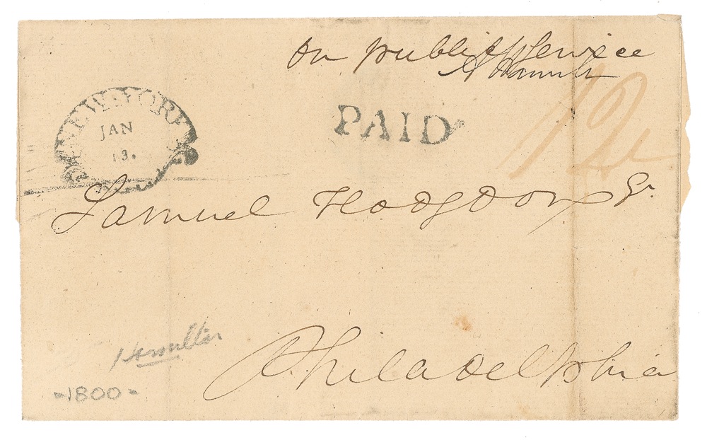 Franking signature, “A. Hamilton,” on a 5.25 x 3.25 (panel size) postal cover addressed in another hand to Samuel Hodgdon in Philadelphia and bearing “New York, January 13” and “PAID” postmarks; a notation in another hand identifies the dispatch as “on public service” (i.e., qualifying for the franking privilege). A docket on one of the flaps dates the original letter to January 13, 1800, and summarizes the subject as “Captain Brock wants clothing.” Hodgdon (1745–1824) served as quartermaster general for a year in 1791–1792. In 1794, after a brief interruption in Hodgdon’s service, Washington appointed him superintendent of military stores, a post he held until Jefferson’s election in 1800. Accompanied by an antique portrait engraving. In very good to find condition, with vrtical folds (one to last name), a touch of very subtle handling wear, toning and soiling, and seal-related tears and losses to flaps (away from address panel). Auction LOA John Reznikoff/PSA/DNA and R&R COA.
