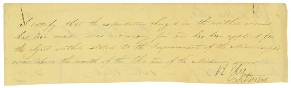 Self-contained partial manuscript DS signed “R. E. Lee, Lt. Engrs,” one page, 8.25 x 2.25, 1838. In full: “I certify, that the expenditure charged in the within account has been made, was necessary for, and has been applied, for the objects within stated, to the improvement of the Mississippi River above the mouth of the Ohio and of the Missouri River.” Slightly irregular trimming to the bottom edge (near but not touching signature) two small rust stains to top edge, crease to one corner, and faint show-through from notations on reverse, otherwise fine, clean condition. Auction LOA John Reznikoff/PSA/DNA and R&R COA.
