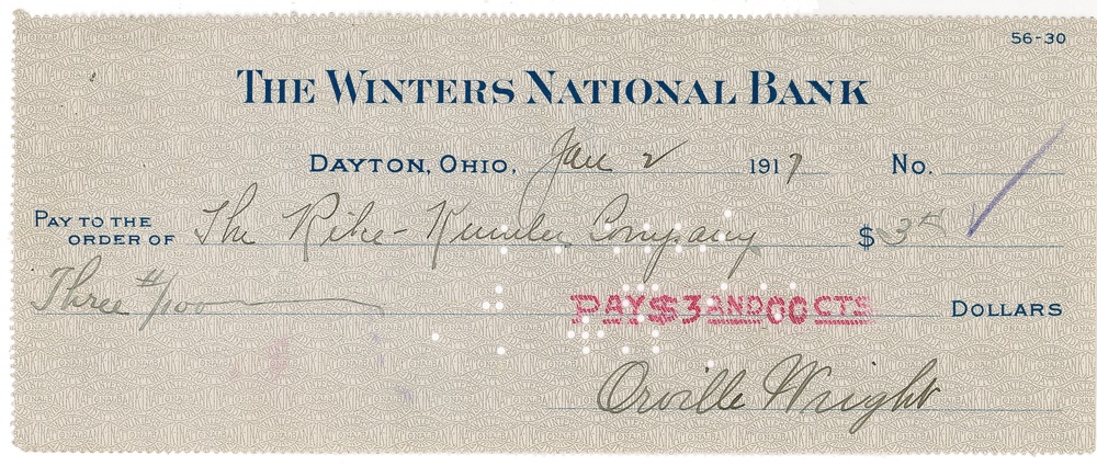 Personal check, 7.5 x 3, filled out in another hand and signed by Wright, payable to The Rike-Kumler Co. (a broadcast station in Dayton, Ohio) for $3.00, January 2, 1917. In fine condition, with usual cancellation holes and stamps, with slight show-through in the signature area from a stamp on the reverse, staple holes in upper left and an unobtrusive blue pencil notation. RRAuction COA.