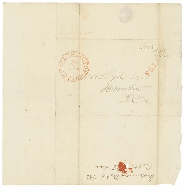 Franking signature, “Paid, R. E. Lee, Lt. Engr.,” on a 5.25 x 3 (panel size) postal cover addressed in another hand to John Lloyd in Alexandria, Virginia, and bearing a “City of Washington, March 7” postmark and “FREE” ink stamp. A docket on one of the flaps dates the item to March 6, 1835. In very good condition, with light toning along two heavy vertical folds (one through signature), a few tiny pin holes, and scattered light wrinkling and mild soiling. A lesser-seen format for Lee! Auction LOA John Reznikoff/PSA/DNA and R&R COA.
