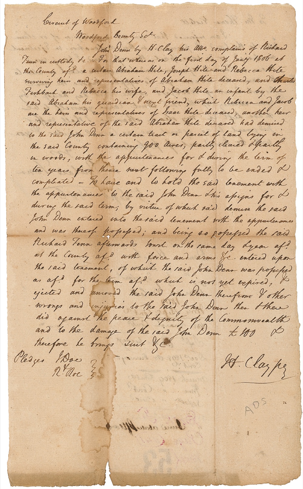ADS, signed “H. Clay,” one page both sides, 7.75 x 13, September 5, 1806. A complaint in a legal case involving a real estate dispute. Clay has also signed a second time within the text. In good condition, with intersecting folds (small holes, chips, and separations), light scattered toning, staining, and faint show-through of ink. The signature is clean and unaffected by any faults, and itself easily rates as fine. RRAuction COA.
