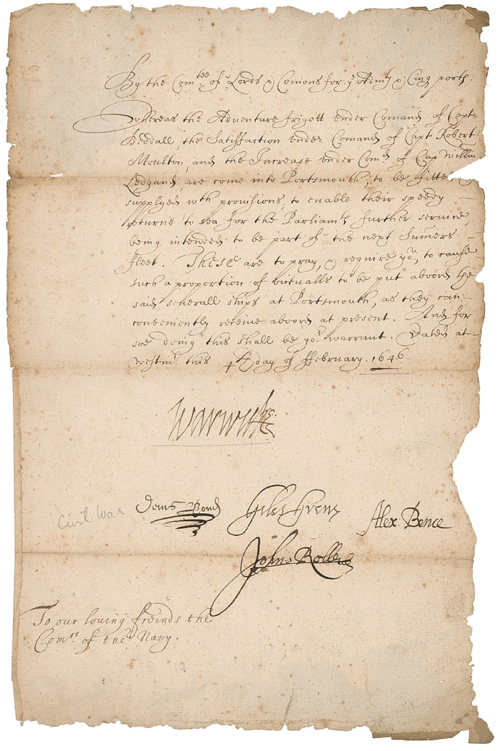 Manuscript DS, one page, 7.75 x 12, February 8, 1646. A document issued by the Committee of Lords and Commons for the Admiralty to the Commissioners of the Navy advising that a frigate under the command of Captain Biddall in the port of Portsmouth is to be fitted with supplies and provisions. The document is signed by [the Earl of] Warwick, Alex. Bence, John Roller, and two others. In good condition, with tears, chips and small losses to edges (slightly touching a few words), scattered toning, foxing, and soiling, and partial separations along folds. R&R COA.