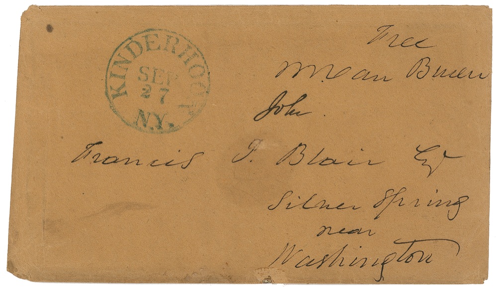 Franking signature, “Free, M. Van Buren,” on a 5.5 x 3.25 mailing envelope addressed in his hand to “Francis J. Blair, Esq., Silver Spring near Washington.” The envelope also bears a September 27, Kinderhook, New York postmark. Even toning, and scattered light creasing and wrinkling, otherwise fine condition. JSA/John Reznikoff Auction LOA and RRAuction COA.