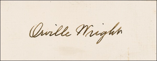Crisp and precise ink signature, “Orville Wright,” on an off-white 3.75 x 1.5 card. In fine condition, with a hint of mild soiling. R&R COA.