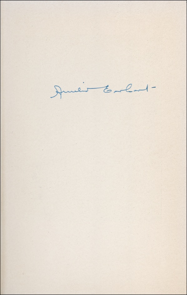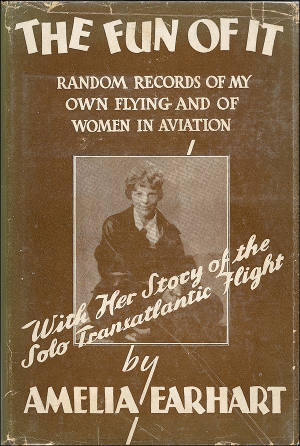 Signed book: The Fun of It. First edition, first printing. NY: Harcourt Brace and Company, 1932. Hardcover, 5.5 x 8.25, 218 pages. Signed in ink on the reverse of her frontis photo “Amelia Earhart.” The book retains its original cardboard phonograph record housed in a pocket on the inside of the back cover. Light soiling and wear (including tears and creases) to jacket, small tears to spine ends, a few mild stains to covers, and toning to rear blank from offsetting of pocket and record, otherwise fine condition. R&R COA.