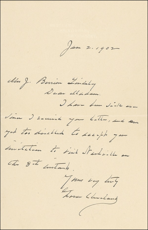 ALS, one page, 4.25 x 6.75, blind-embossed personal letterhead, January 2, 1902. Cleveland writes to Mrs. J. Berrien Lindsley in Nashville. In full: “I have been sick ever since I received your letter, and am yet too disabled to accept your invitation to visit Nashville on the 8th instant….” Accompanied by the original mailing envelope addressed in Cleveland’s hand. In very fine condition. Auction LOA John Reznikoff/PSA/DNA and R&R COA.