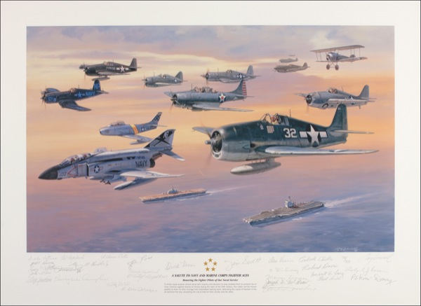 Color limited edition print titled “A Salute to Navy and Marine Corps Fighter Aces,” 72/300, 30 x 22, signed in pencil by more than two dozen aces, including Randall Cunningham, Ed Copeland, Dick Rossi, R. Bruce Porter, Jack Watson, Joe Foss, Chuck Haverland, Guy Bordelon, Jim Swett, George Axtell, Chuck Older, Herbert Long, Robert Davis, Chuck Smith, Archie Donahue, William Driscoll, Paul Drury, Edward Feightner, Marvin Franger, Ray Hawkins, Charles Kunz, Joseph McGraw, Ralph Rosen, Stanley Vejtasa, Alex Vraciu, and “Lin” Lindsay, and also signed in pencil by the artist Roy Grinnell. Rolled and in fine condition. R&R COA.