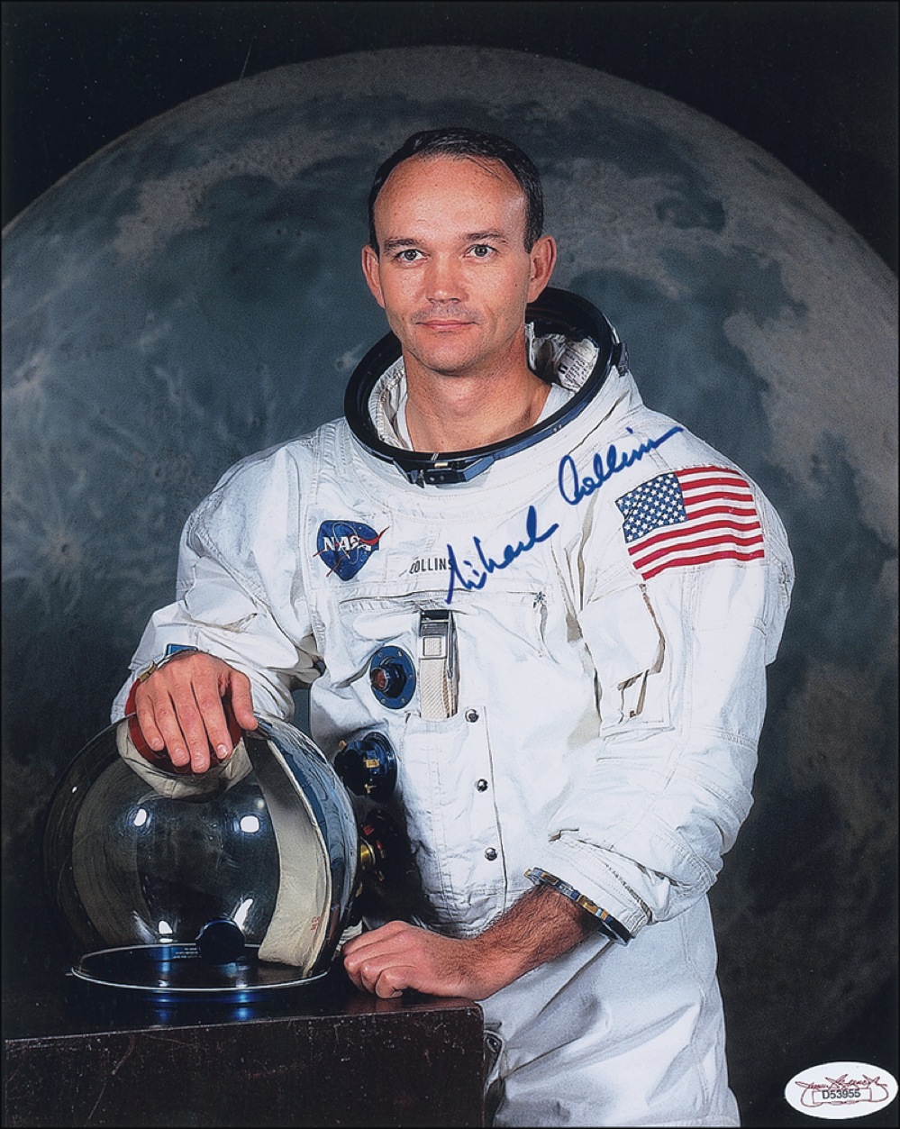 Color glossy 8 x 10 photo of Collins posing in his space suit against a lunar background, signed in blue felt tip. Accompanied by a certificate of authenticity from James Spence and Novaspace. In very fine condition, with a James Spence authentication label affixed to lower corner. COA Scott Cornish and RRAuction COA.