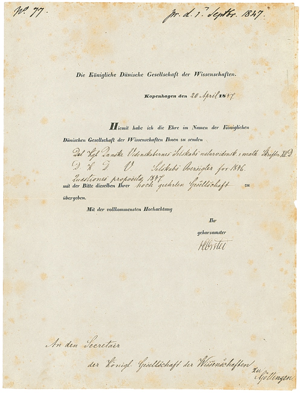 Danish physicist (1777-1851), he discovered the diversion of a magnetic needle by electric current, becoming the founder of the rule of electromagnetism. DS, in his native language, signed “H. Oersted,” one page, 8.5 x 11, Royal Danish society of the Sciences letterhead, September 1, 1847. Oersted transmits academic publications to the secretary of the Gottingen Royal Society of Sciences. In fine condition, with a bisecting horizontal fold, several ink notations, and scattered foxing. R&R COA.