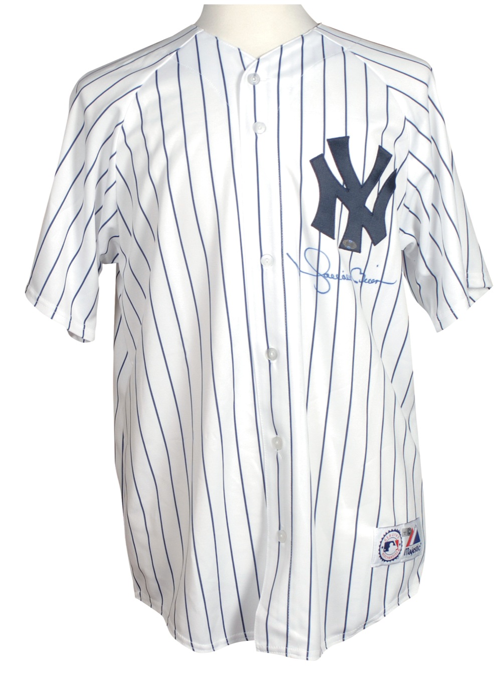 Official Majestic replica New York Yankees home baseball jersey, with sewn on numbers and letters, signed in blue felt tip on the front. Accompanied by a certificate of authenticity from Steiner. In very fine condition. Auction LOA Steve Grad/PSA/DNA and R&R COA.