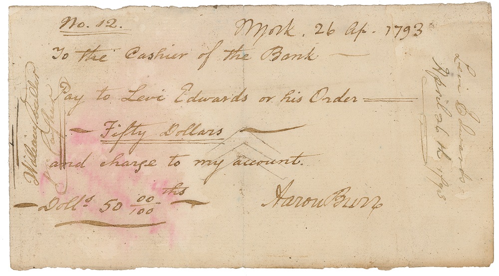 Manuscript check, 6 x 3.25, filled out in another hand and signed by Burr, payable to Levi Edwards or his order for $50.00, April 26, 1793. Clean cut cancellations (away from signature), faint show-through from later ink notation to reverse, and a hint of mild soiling and toning, otherwise fine condition. R&R COA.