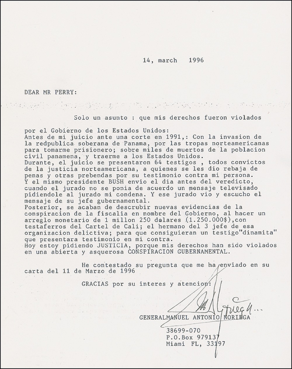 Leader of Panama (born 1934) from 1984 until he was deposed in 1990. He was later tried and convicted of drug trafficking, racketeering, and money laundering, and sentenced to 40 years (later reduced to 30 years). Photocopied TLS in Spanish, signed in ink “M. A. Noriega,” one page, 8 x 9.5, March 14, 1996. A form letter sent out by Noriega during his incarceration outlining the injustices and conspiracy against him by the U.S. Government. In fine condition. R&R COA.