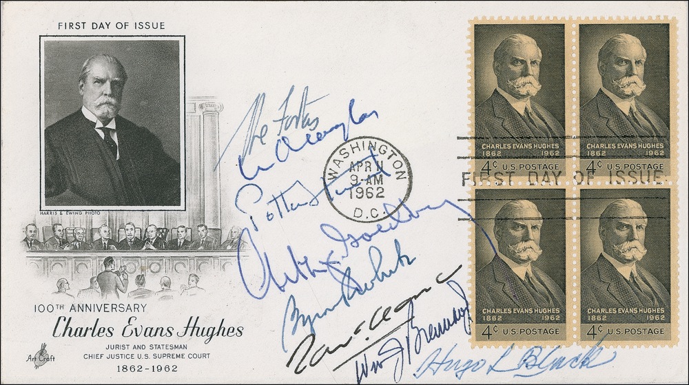 FDC, 6.5 x 3.5, 1962, with a cachet honoring the 100th Anniversary of Charles Evans Hughes, signed in various inks by Abe Fortas, W. O. Douglas, Potter Stewart, Arthur Goldberg, Byron R. White, Tom C. Clark, Wm. J. Brennan, Jr., and Hugo L. Black. A few signatures very slightly touching stamps, otherwise fine condition. R&R COA.
