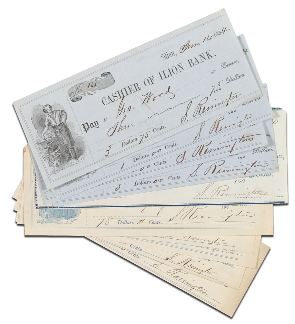 American firearms manufacturer (1819–1892). Ten bank checks, 1854–60, each filled out and signed as “S. Remington.” Usual clean cut cancellations (not affecting signatures), a hint of mild scattered toning, and a few light folds and brushes to signatures, otherwise fine condition. R&R COA.a