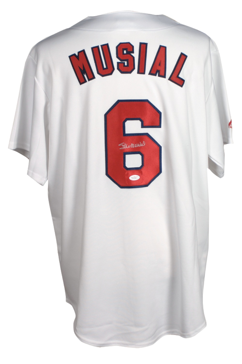 Official Majestic replica St. Louis Cardinals baseball jersey, with sewn on letters and numbers, signed in silver ink on the number on the back. Accompanied by a certificate of authenticity from James Spence. In very fine condition. Auction LOA Steve Grad/PSA/DNA and RRAuction COA.