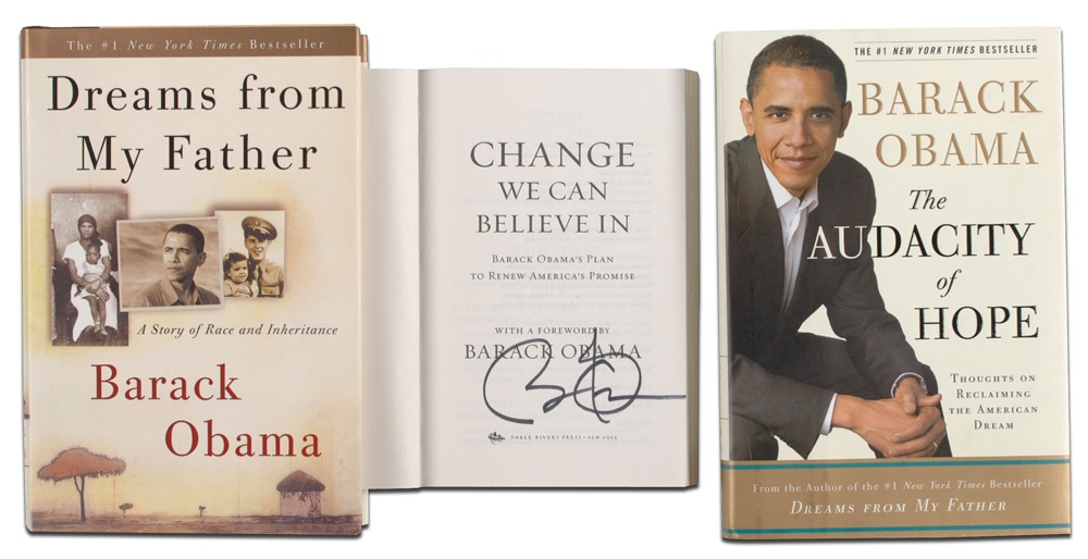 Three signed books: hardcover copies of Dreams from My Father and The Audacity of Hope, and a softcover copy of Change We Can Believe In, each signed on the title page in black felt tip. In very fine condition. R&R COA.