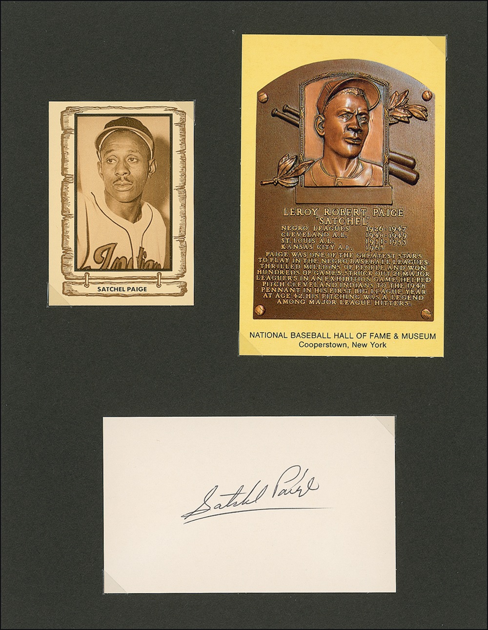 Ballpoint signature, “Satchel Paige,” on an off-white 5 x 3 card. In very fine condition. Auction LOA Steve Grad/PSA/DNA and R&R COA.