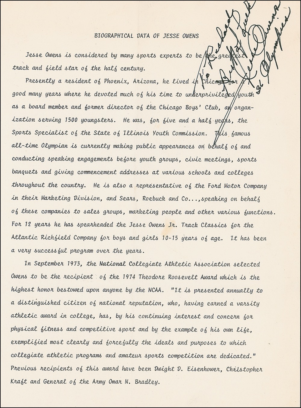 One page biographical sheet on Owens, 8.5 x 11, signed and inscribed in the top right corner, “To Richard, Best of luck, Jesse Owens, 36 Olympics.” Bisecting vertical fold, and a touch of light toning, otherwise fine condition. Auction LOA Steve Grad/PSA/DNA and R&R COA.