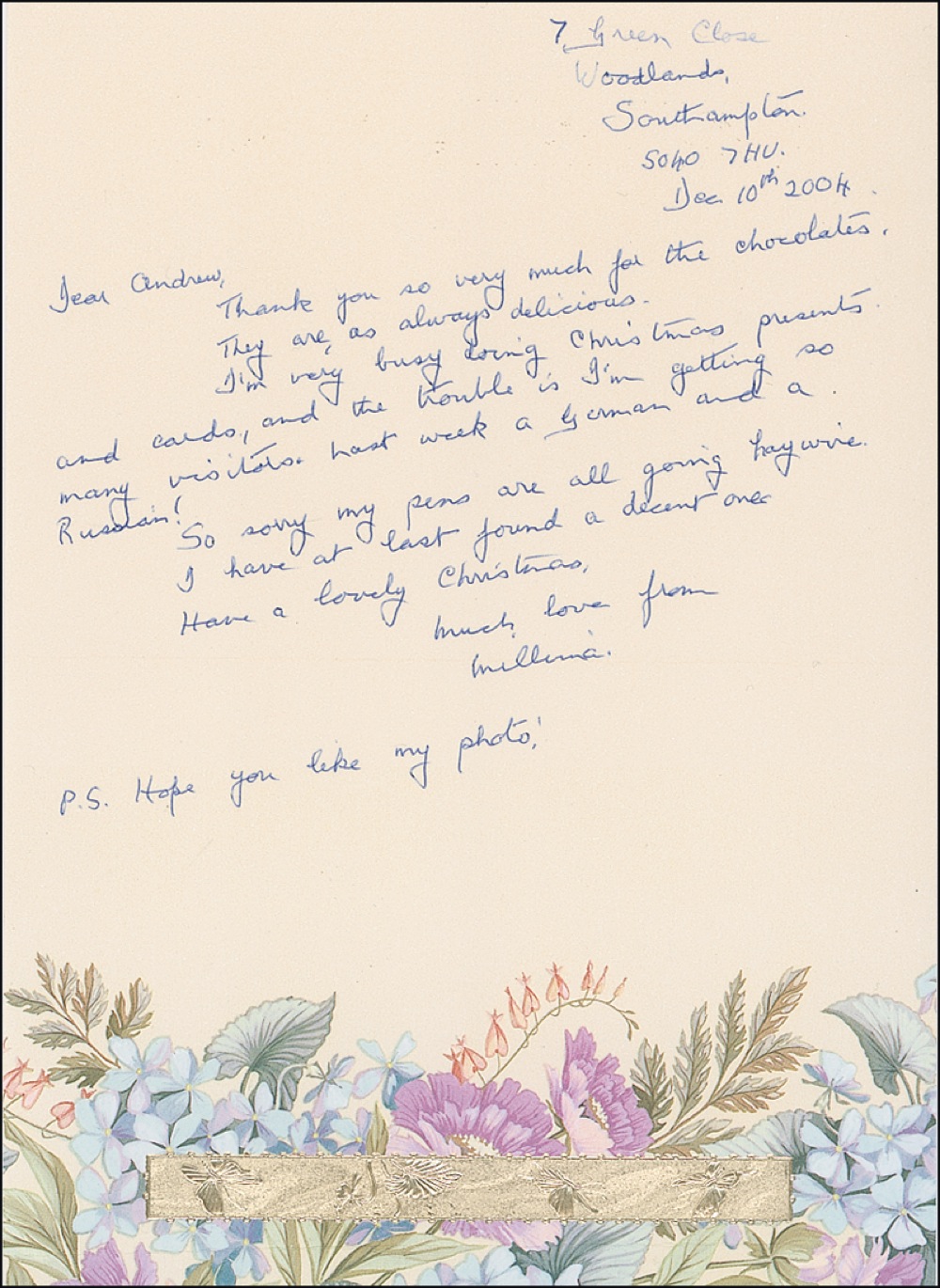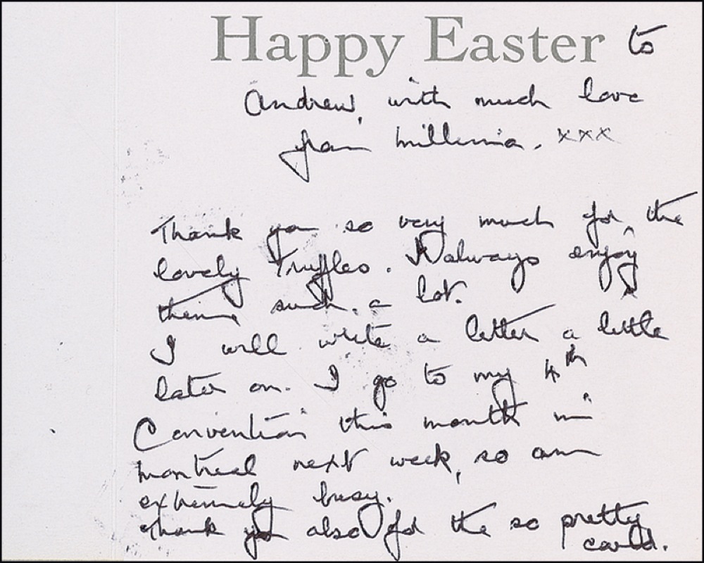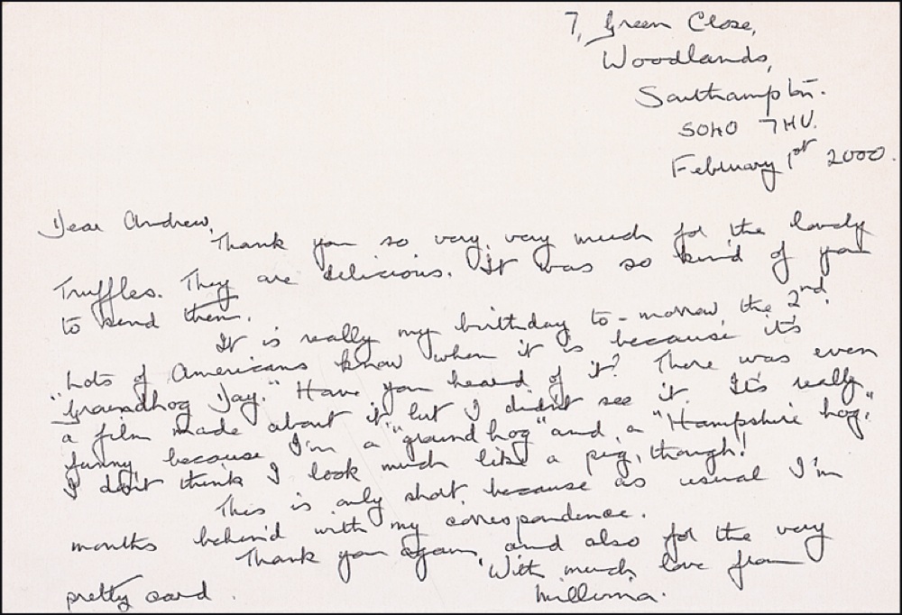 Youngest and last remaining survivor of the sinking of the Titanic (born 1912). Three ALS signed “Millvina,” various formats (including greeting cards), 2000–2004. Dean writes to Andrew with personal news, holiday greetings, and thanks for gifts, and mentioning in one that she is to attend a convention in Montreal. Mild handling wear, otherwise fine condition. R&R COA.