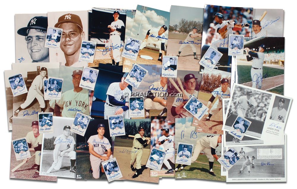Sixty-two items consisting of 40 signed glossy and satin-finish 8 x 10 photos, some color, and 22 Yankee Signature Series trading cards. Photo signers are: Phil Rizzuto (2), Homer Bush (2), Moose Skowron (2), Jim Bouton (2), Don Larsen (2), Bobby Richardson (2), Clete Boyer (2), Ruben Rivera (2), Any Fox (2), Dale Berra (2), Jim Spencer (2), Ron Blomberg (2), Rusty Torres, Johnny Kucks (2), Eli Grba (2), Hector Lopez (2), Dave LaPoint (2), Bill Gordon (2), Jack Cullen (2), Hank Bauer, Elmer Valo, and Gary Waslwski. Cards are signed by Bobby Shantz (2), Norm Siebern, Al Gettel, Randy Gumpert, Jerry Lumpe, Dave Righetti, Luis Tiant, Bucky Dent, Ralph Houk, Bobby Cox, Johnny Kucks, Virgil Trucks, Ryne Duren, Al Downing, Steve Balboni, Charlie Silvera, Ruben Amaro, Hal Reniff, Lew Burdette, Tommy Byrne, and Brian Doyle. In fine condition. R&R COA.