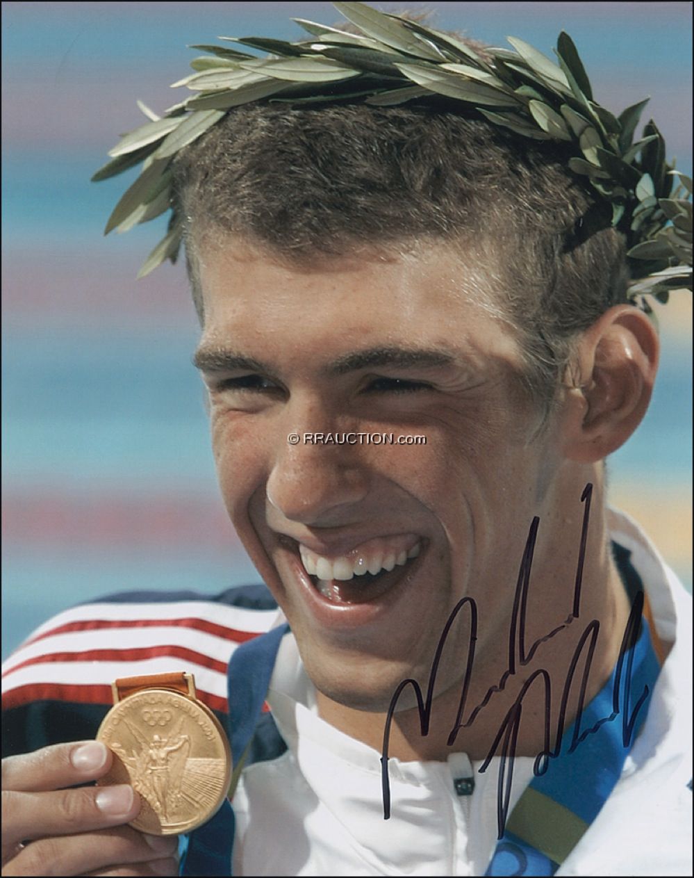 Color glossy 8 x 10 close-up photo of Phelps proudly showing off a gold medal, signed in black felt tip. In very fine condition. Auction LOA Steve Grad/PSA/DNA and R&R COA.