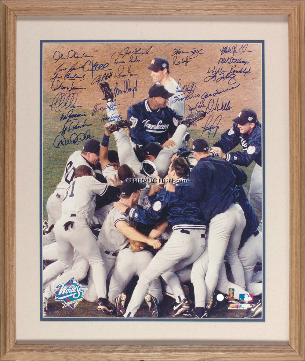 Color glossy 16 x 20 photo of the 1998 New York Yankees jumping all over each other celebrating their World Series victory, signed in blue felt tip by 27 team members, including David Cone, Paul O’Neil, Bernie Williams, David Wells, Joe Girardi, Joe Torre, Shane Spencer, Derek Jeter, Scott Brosius, Mike Stanley, Don Zimmer, Mariano Rivera, Andy Pettitt, Mel Stottlemyre, Willie Randolph, and Ramon Hernandez. Double matted and framed to an overall size of 22.5 x 26.5. This Yankee team would record the most wins of any Yankee team (125), and would often draw comparisons to the 1961 Yankee team. In very fine condition. Auction LOA Steve Grad/PSA/DNA and R&R COA. Oversized.