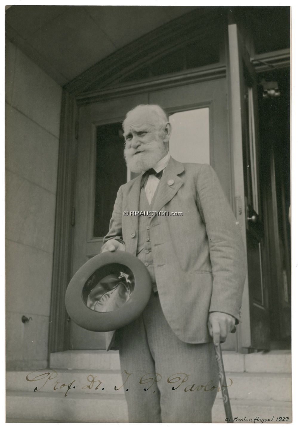 Russian physiologist (1849–1936) best known for his investigation of conditioned reflex through the use of experiments involving salivating dogs. He was awarded the Nobel Prize in Medicine in 1904. Matte-finish 6.75 x 10 photo of Pavlov with his hat in one hand and a cane in the other, signed in ink “Prof. Dr. I. P. Pavlov.” The photo also bears a notation in another hand, “at Boston, August 1929,” at the lower right corner. Accompanied by a letter from the previous owner explaining the history and provenance of the item. In full: “According to Andrew J. Kozar, this signed photograph was obtained by Arthur H. Steinhaus at the 13th meeting of the International Congress for Physiology, Boston, August 1929. Steinhaus taught at George Williams College in Illinois and was a well-known researcher on the subject of sport physiology and exercise. Professor Andrew J. Kozar of the University of Tennessee obtained the photo from the son of Steinhaus in 1974 and it has been in his possession until the time of its transfer to me in May of 2008. [Signed] David E. Slough.” Ink just a shade light but clearly legible, and possible slight, neat trimming to edges, otherwise very fine, clean condition. Auction LOA John Reznikoff/PSA/DNA and R&R COA.